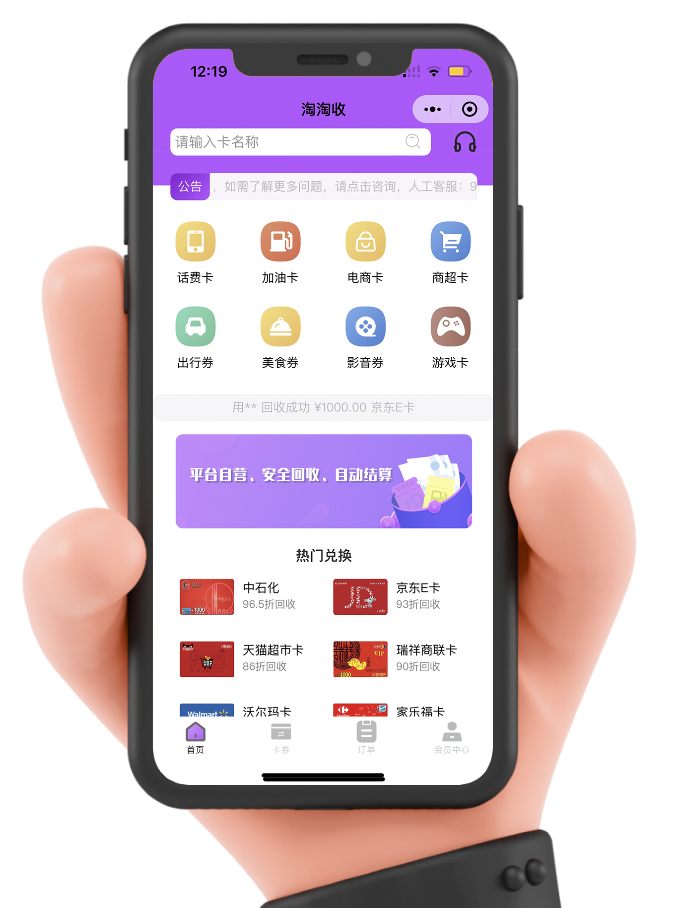 淘淘收具有稳定快速的出卡渠道,最快1秒即可卖出并立即进行结算,无需等待,卖出卡券后即可进行提现,支持支付宝、微信、银行卡,没有手续费,方便快捷。
